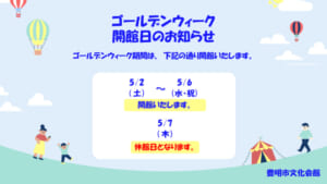 ゴールデンウィーク期間中、下記のとおり開館いたします。